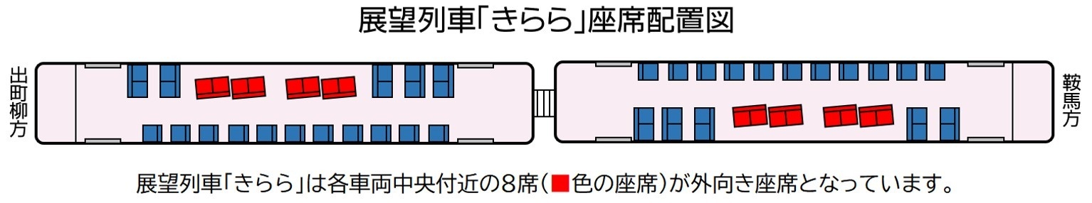・展望列車「きらら」の座席は固定となっており、進行方向に転換できるタイプの座席ではございません。外向き座席以外、往路または復路のいずれかが進行方向と逆向きになります。