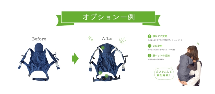 抱っこやおんぶを快適に行えるおんぶひもをベースにお客様のお身体に合わせたカスタムオーダー。ベースとなる型から生地・パーツなどをお選びいただく“カスタムオーダースタイル”ですので、ゼロから製造するオーダーメイドに比べ、出来上がりをイメージしやすく、お手軽にご注文いただけると好評です。また、無料でデモ機を貸出していますので、ぜひご利用ください。