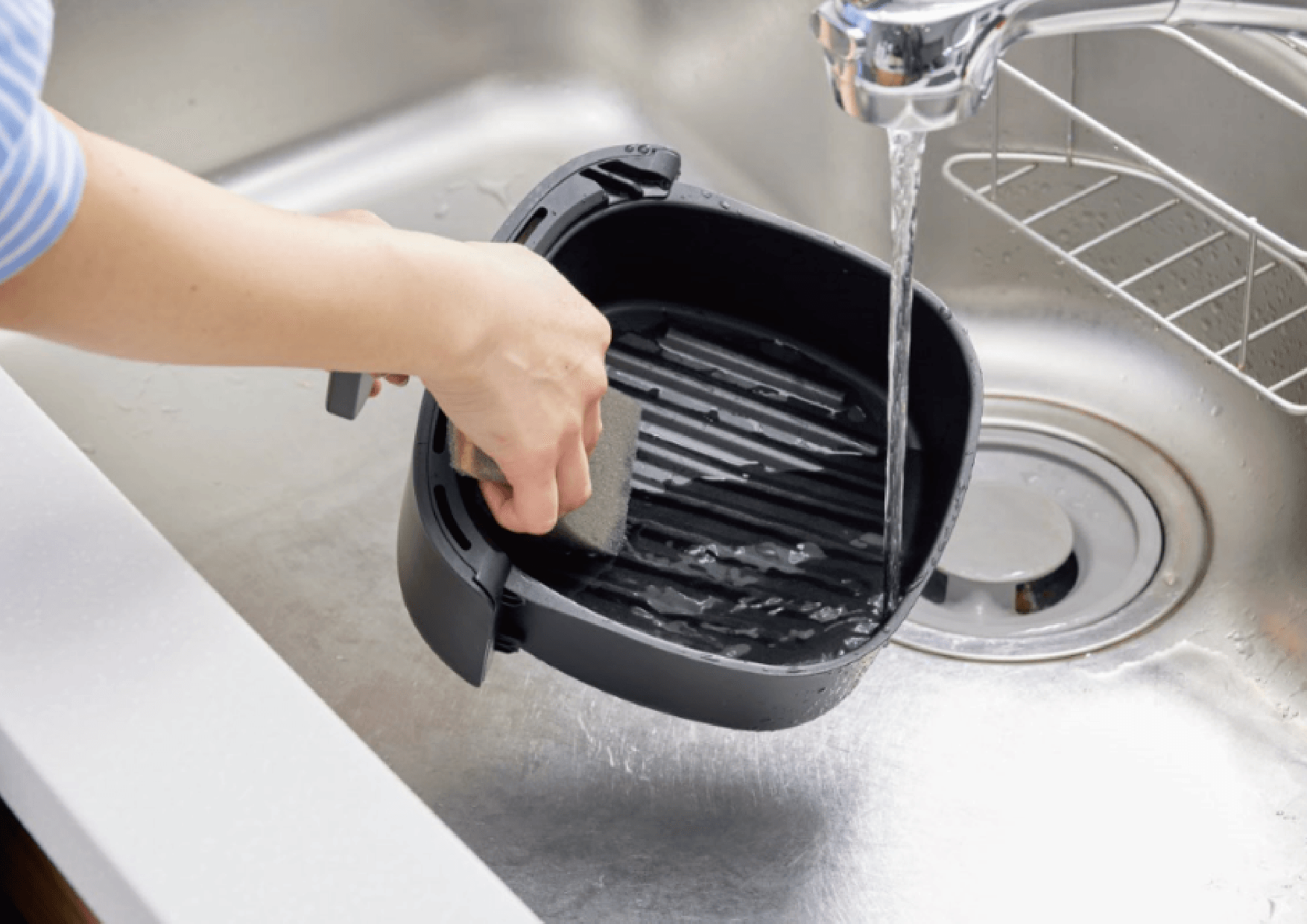 軽量でコンパクトなバスケットと、ヒーターへの油跳ねを軽減する「ヒーターガード」は、取り外し可能で、この2つを洗うだけでOK!油を使わないから、油の後始末やコンロ回りへの飛び跳ねの心配もありません。
