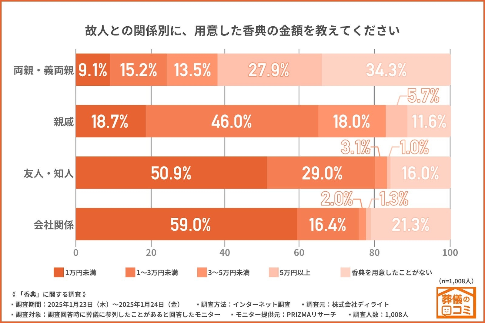 会社関係の香典は最も少額で、1万円未満が約6割を占め、他の関係性と比べて負担が軽いことが示されました。会社関係の葬儀では、同僚や上司と金額を揃える傾向が強いため、相場が比較的統一されていると推測されます。