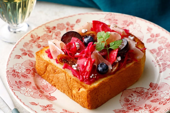 ◇ぶどうと生ハムとビーツのはちみつがけトースト