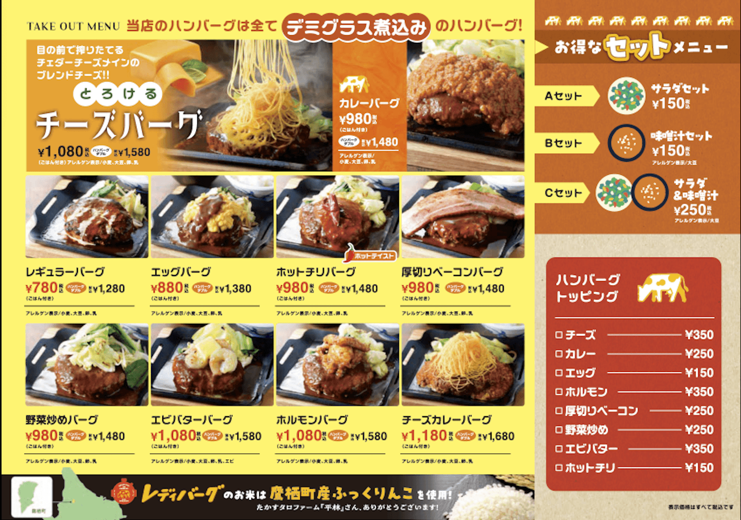 ・レギュラーバーグ 780円・エッグバーグ 880円・ホットチリバーグ 980円・厚切りベーコンバーグ 980円・野菜炒めバーグ 980円・エビバターバーグ 1,080円・ホルモンバーグ 1,080円・とろけるチーズバーグ 1,080円・チーズカレーバーグ 1,180円