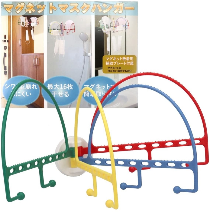 洗濯手洗する場所の洗面台やバスルームに干す場所がない!という発想から生まれた商品です。今にも飛びそうなアーチ型のハンガー!根元がマグネットなので移動してお使いいただけます。アーチ部分には帽子やマスクなどカーブがあるものを干しても型崩れせず、シワになりません。付属のシール付き金属プレートを壁に貼ればどこでも干すことが出来ます。