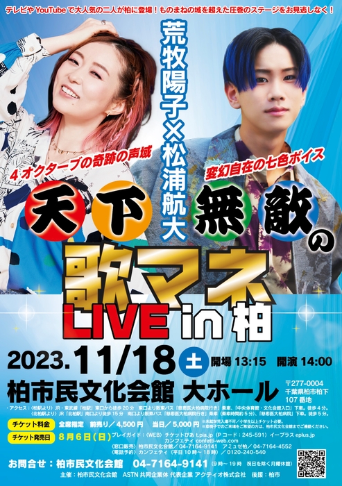 柏市民文化会館(ASTN共同企業体 代表企業アクティオ株式会社)主催、『天下無敵の歌マネLIVE in 柏』が2023年11月18日 (土)に柏市民文化会館 大ホール(千葉県柏市柏下107)にて開催されます。