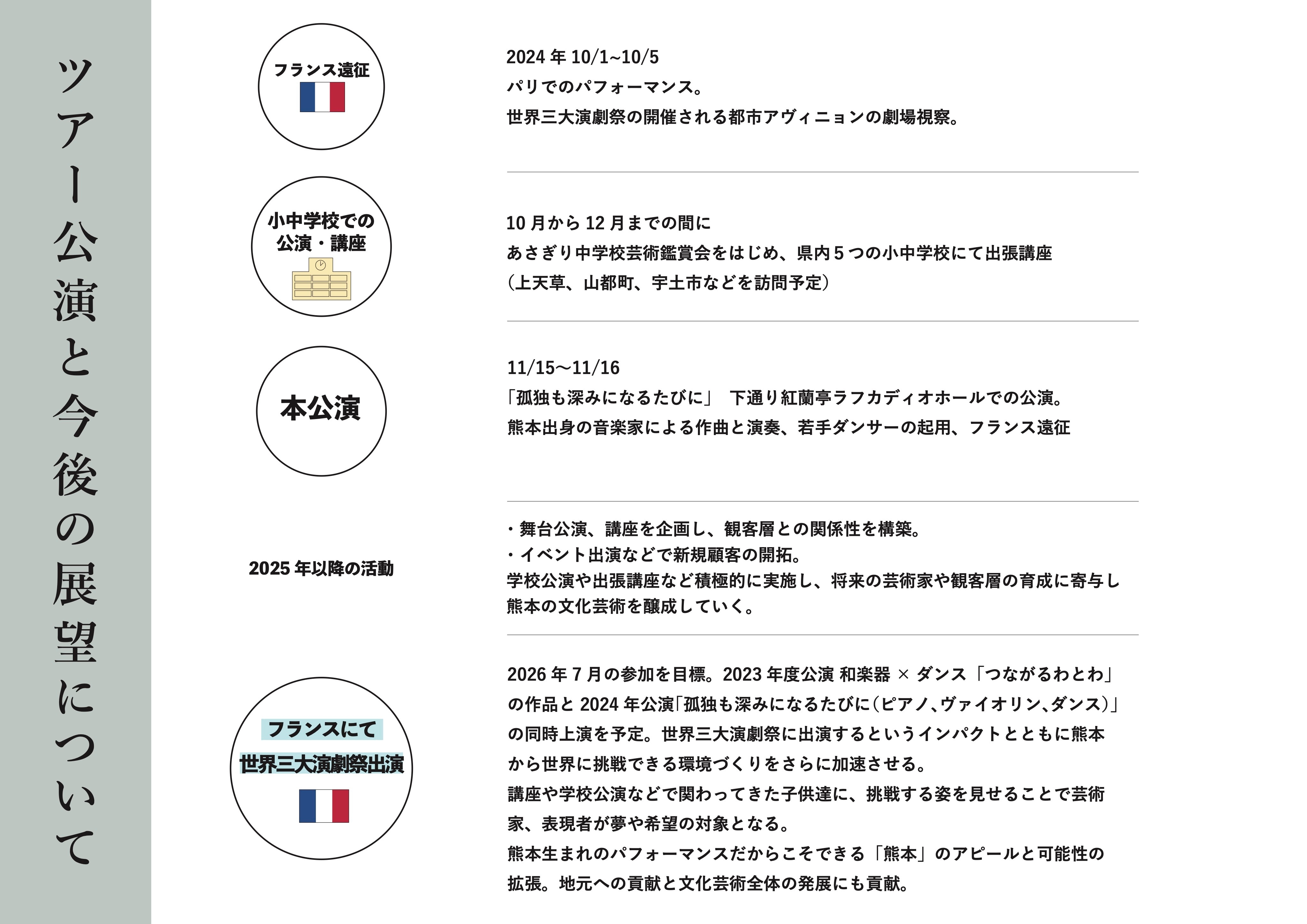 2026年7月に行われるフランスの世界3大演劇祭への参加が目標。2023年度公演 和楽器×ダンス「つながるわとわ」の作品と2024年公演「孤独も深みになるたびに(ピアノ、ヴァイオリン、ダンス)」の同時上演を予定。世界三大演劇祭に出演するというインパクトとともに熊本から世界に挑戦できる環境づくりをさらに加速させます。講座や学校公演などで関わってきた子供達に、挑戦する姿を見せることで芸術家、表現者が夢や希望の対象となります。熊本生まれのパフォーマンスだからこそできる「熊本」のアピールと可能性の拡張。地元への貢献と文化芸術全体の発展にも貢献。
