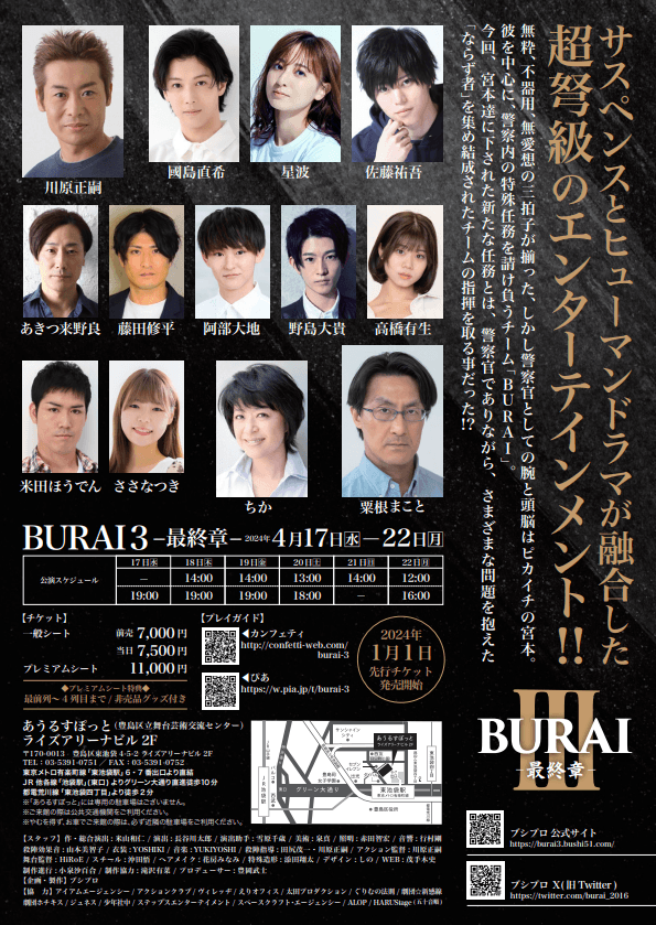 ブシプロ第4回公演『BURAI3』が2024年4月17日(水)~4月22日(月)にあうるすぽっと(東京都豊島区東池袋 4-5-2 ライズアリーナビル 3F)にて上演されます。