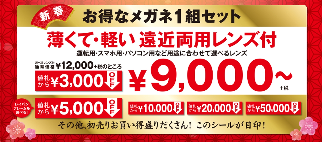 薄くて軽い遠近両用レンズが付いて、メガネ1組 通常価格¥12,000+税のところ、値札から¥3,000 OFFの¥9,000+税 より 、¥5,000 OFF、¥20,000 OFF、¥50,000 OFFとお買い得商品が盛りだくさん! ※メガネ1組(フレーム+レンズ)ご購入時の適用となります。