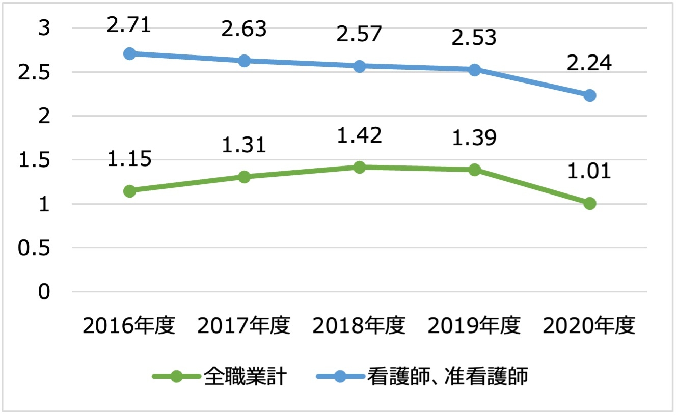 現在、就業している看護師数は、2009年は約143万人、2019年には約168万人と、10年間で約25万人も増加していますが、看護師及び准看護師の有効求人倍率は、2.24倍と全職種の中でも大幅に上回って推移しており、ニーズに対して看護職員が大幅に不足しているのが現状です。