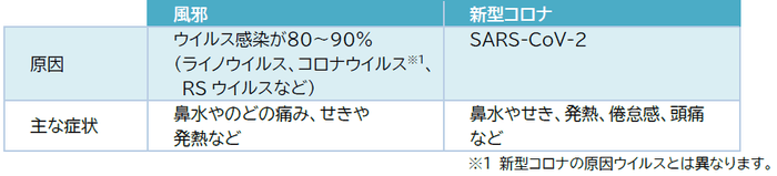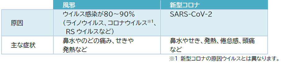 皆さんは一般的な風邪と新型コロナの違いを知っていますか?その原因や症状を表にまとめてみました。