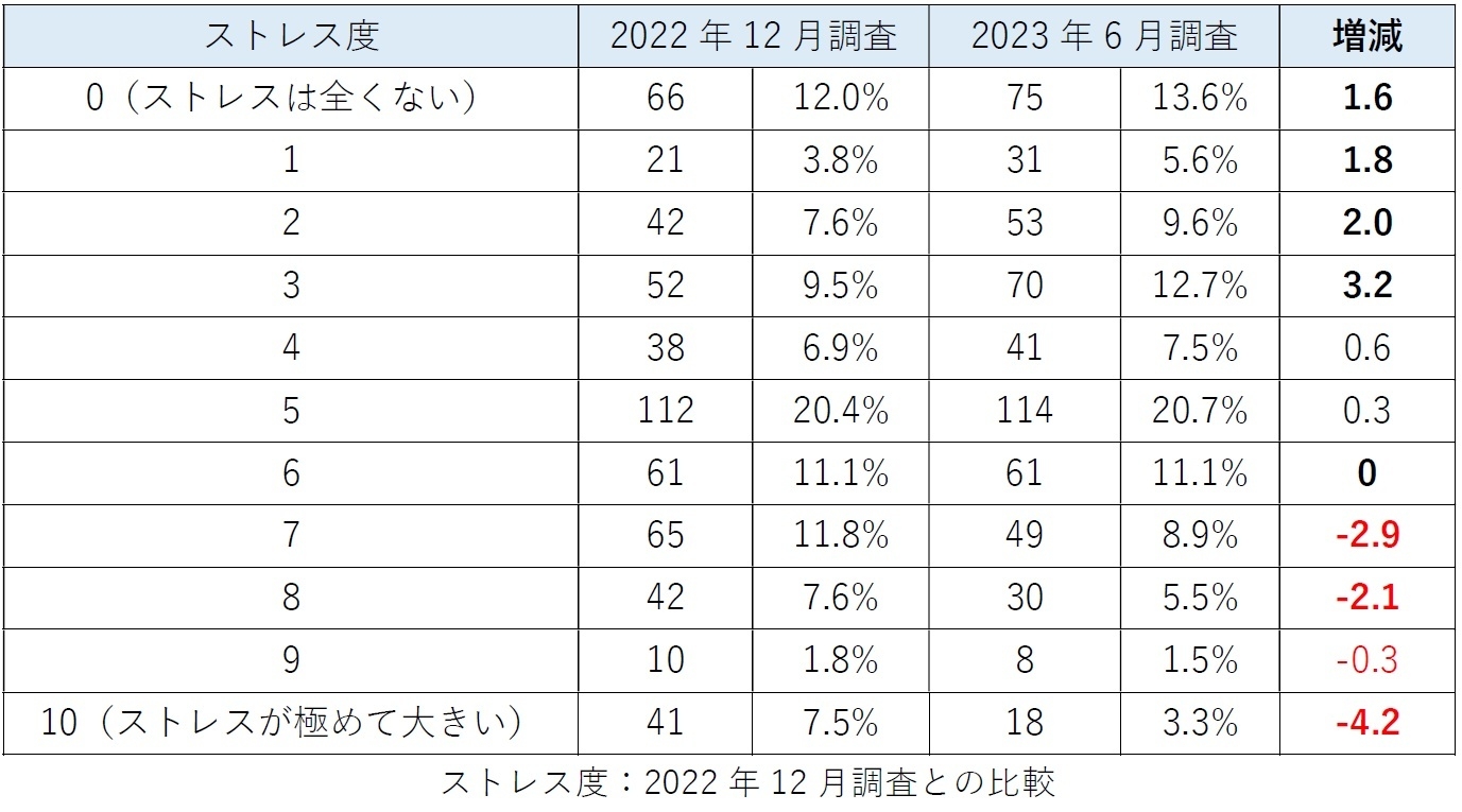 また、昨年12月と比較すると、10(ストレスが極めて大きい)人が7.5%から3.3%と、4.2ポイント減少しており、全体的にストレスが減少していることが分かります。