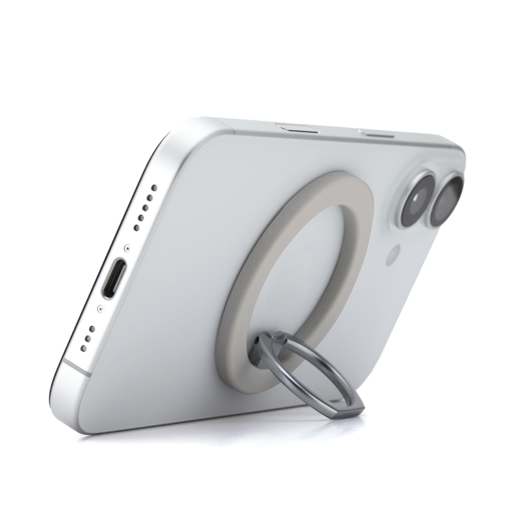 本商品は、MagSafe機能をもつスマートフォンに、強力な磁力でピタッとくっついてスマホを持ちやすくするリングホルダーです。