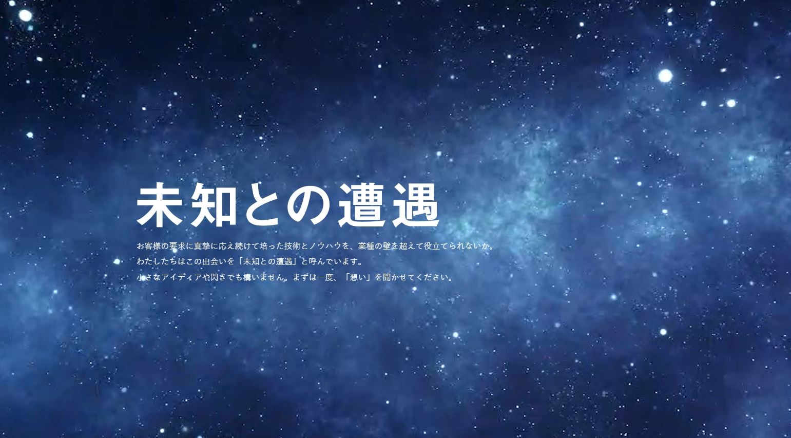 当社は1976年、工業用ダイヤモンド販売の商社として創業。確かな技術と提案力でお客様の要求に応え続け、時代に必要とされる製品を生み出してきました。「これまで培ってきた技術やノウハウを、業種の壁を越えて役立てたい。」 そんな挑戦心から、創業50年を間近に新コンテンツ「未知との遭遇」を制作いたしました。