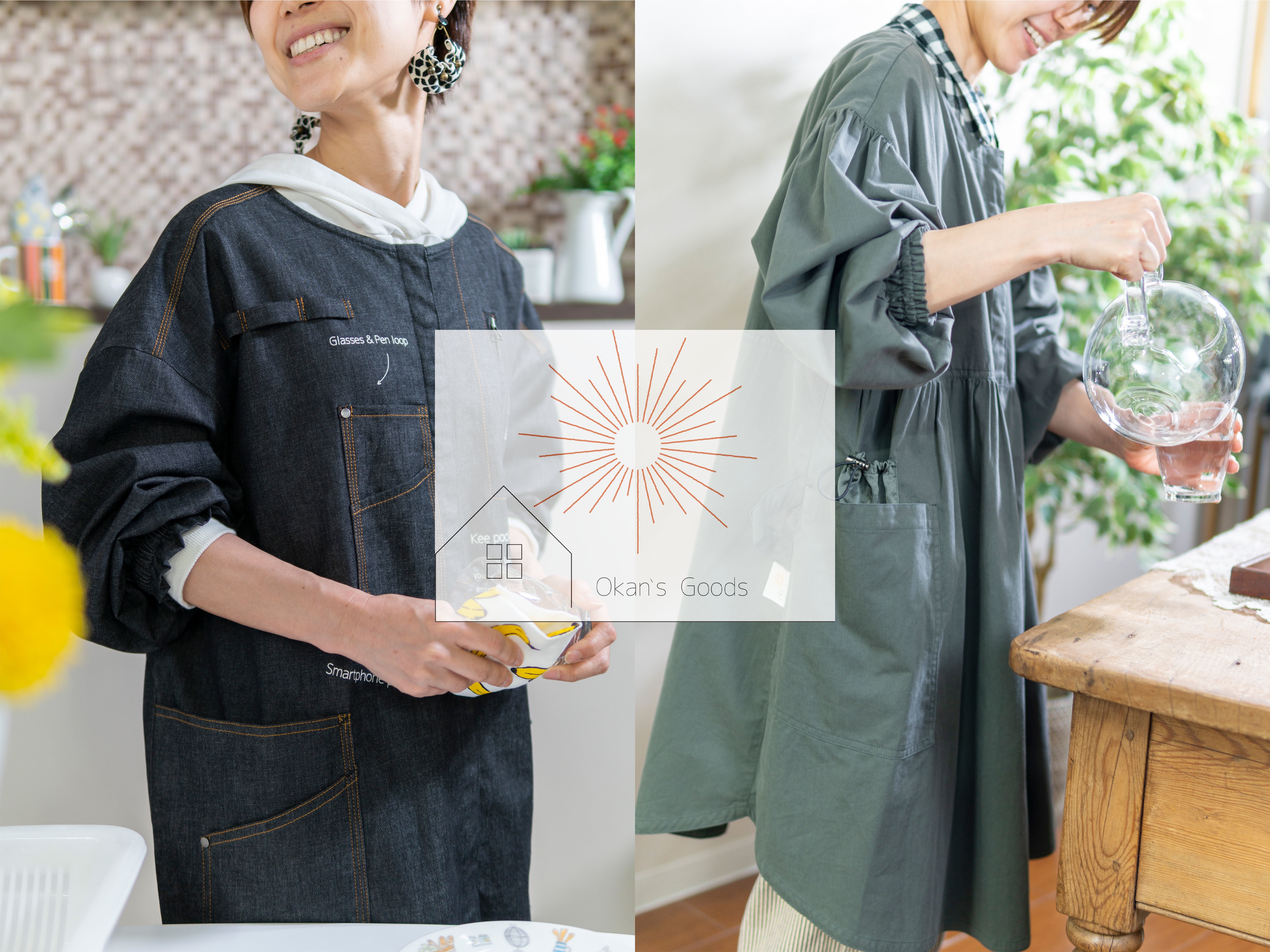 「Okan's Cappo」は、台所仕事や掃除などの家事をするときに活躍する割烹着を、オシャレに可愛くし、さらに使い勝手を良くした新アイテムです。デニム地で機能ポケットをたくさん付けたタイプと、シンプルながら細かいディテールにこだわったタイプの2種類を用意。どちらも撥水加工はもちろん、主婦層へのアンケートで要望の多かった機能ポケットと、アウターとしてそのまま外出できるデザインが魅力。