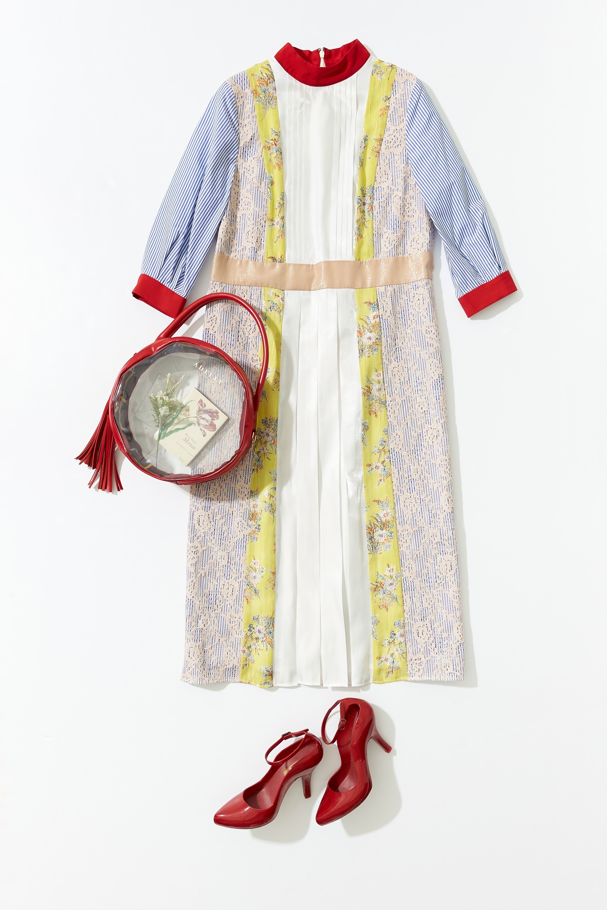 ブランドを代表するアイテムであるパッチワークワンピースは、1枚でスタイリングが完成し、ここぞというときに着ていきたい女性を輝かせるこだわりがつまった1枚。小花柄、レース、ストライプなどの生地を大胆に使用し、遊び心を散りばめたデザインは、襟元にビビットカラーを配したことで顔映りも良く、ゆったりした着用感ながら縦パネルのデザインでスラリとした印象です。