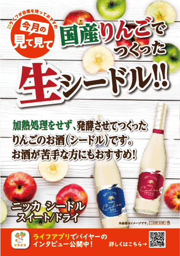 ”シードル”は、フランスなどで古くから愛されているりんごのスパークリングワイン。ワインに比べ低アルコールで飲みやすくフルーティーな味わいが特徴で、近年クラフトビールに続くブームになっています。ライフが自信を持っておすすめする「今月の見て見て」の4月商品に選ばれた「ニッカ シードル(スイート・ドライ)」は、国産りんご100%使用、糖類・香料不使用でみずみずしい味わいが特徴の、品質にこだわった”生シードル”です。首都圏ライフ123店舗にて販売中です。