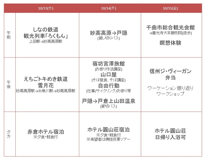 観光列車の平日運行、平日のホテル客室有効利用といった遊休資源を活用したワーケーションを提供するため、長野と新潟の宿、食事、温泉、それぞれの魅力をゆったり堪能できる豪華なプランとなっています。