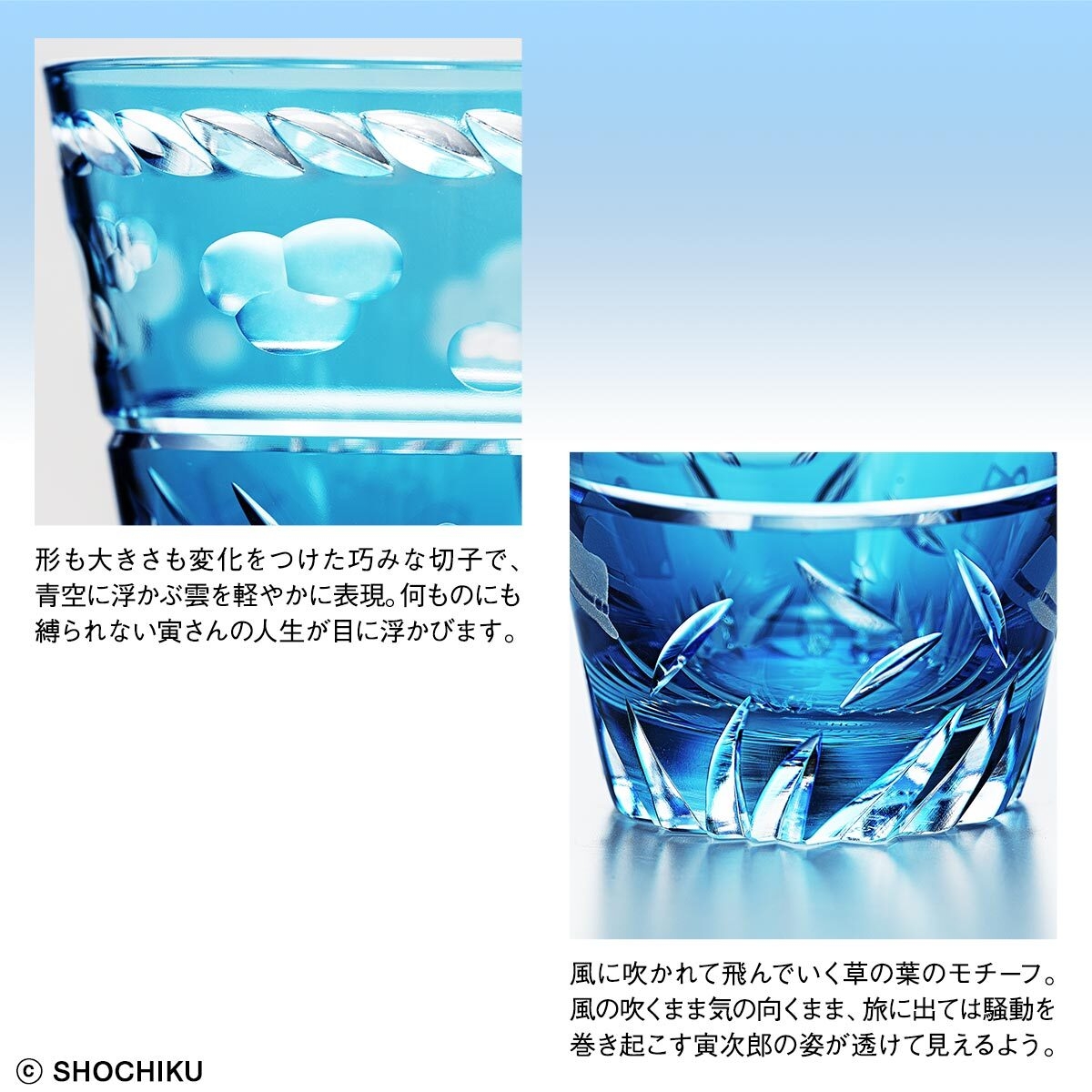 ■澄みきったブルーの色被せガラスに広がるのは、青空にぽっかり浮かんだ雲を眺める寅さんの風のように自由気ままな人生。
