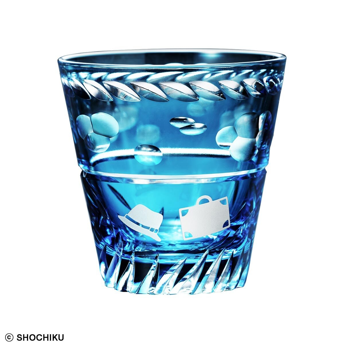 ねじり鉢巻や風に揺れる草の葉のモチーフが、白い雲とともに高度な切子カットでぐるりと刻まれ、おなじみの帽子とトランクも、サンドブラストで浮かび上がります。