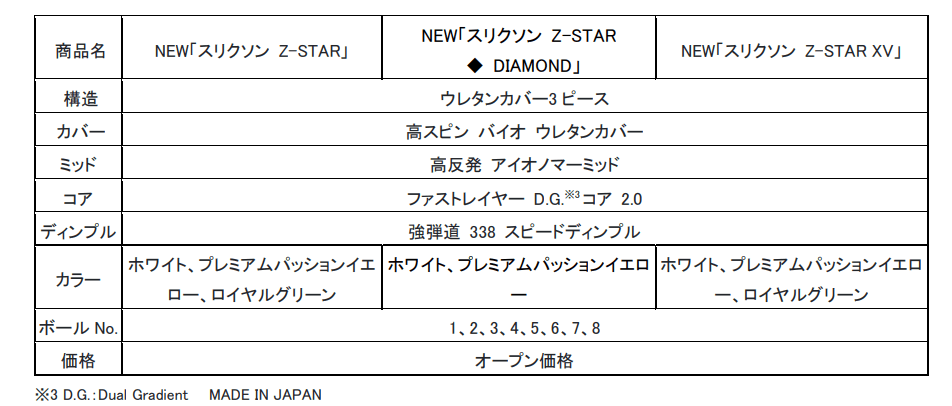 ◆ DIAMOND(ダイヤモンド)」、そしてドライバーで最高レベルの飛距離性能を誇る攻めのNEW「スリクソン Z-STAR XV」という特性の異なる3モデルをラインアップし、ボール選びにこだわるゴルファーのニーズに応えます。