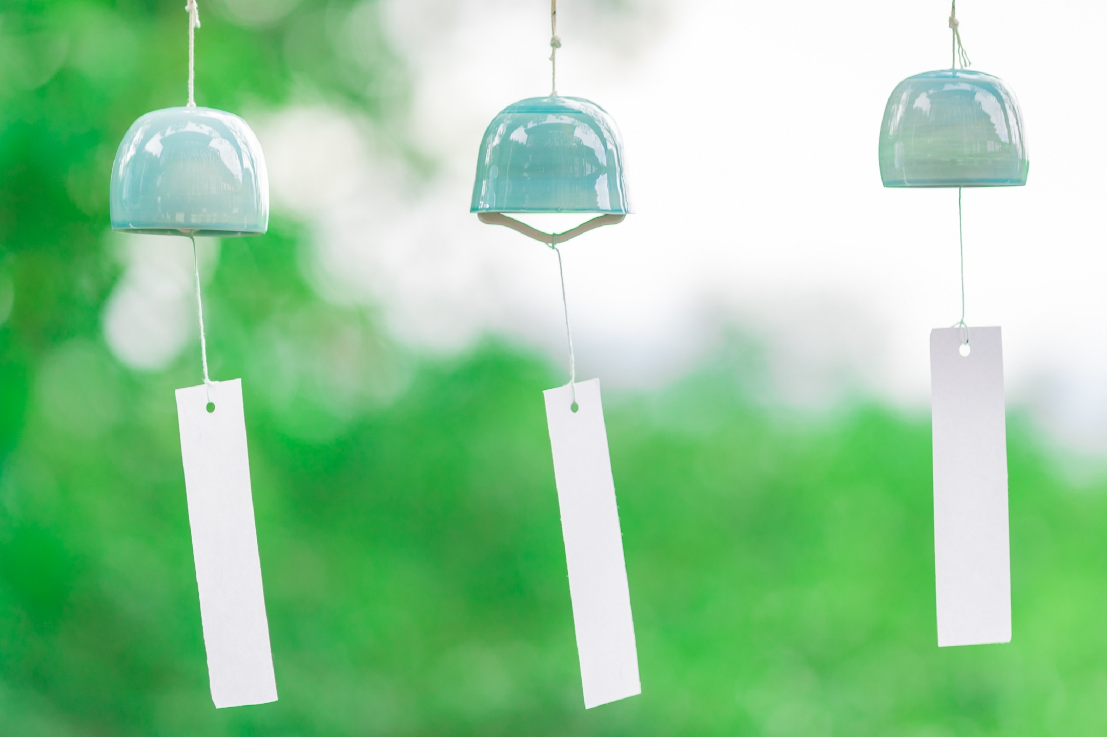 小田原にアトリエを構える「ipada glass」の職人が手掛ける青色のガラス風鈴。1つ1つ異なる音、色、形が魅力的な世界観を演出します。