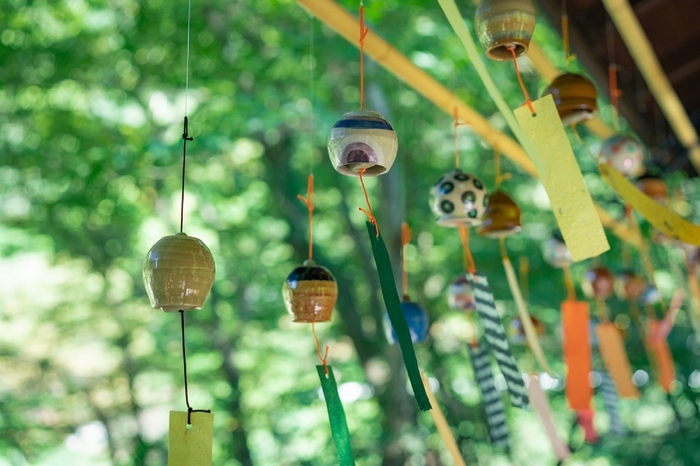 渓流沿いに佇む里山の温泉旅館「界 川治」では、森の中の足湯に、栃木県の伝統工芸「小砂焼」の風鈴を設えます。眼前を流れる男鹿川のせせらぎと風鈴の音色で湯上がりのひとときを過ごせます。