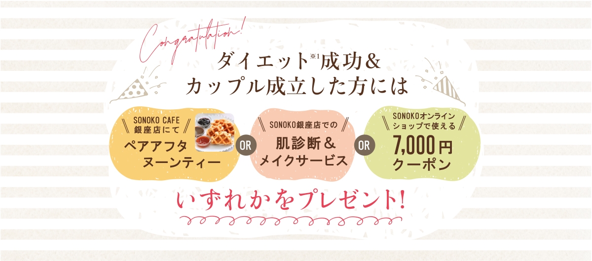 一日三食を食べるだけのダイエット献立を考案した料理研究家 鈴木その子創業の株式会社SONOKO(本社:東京都中央区銀座、代表取締役社長:宇田川 裕昭、以下SONOKO)は、国内最⼤の婚活パーティーポータルサイト『オミカレ』を運営する株式会社オミカレ(本社:東京都杉並区、代表取締役:⻄村晃)とコラボレーションし、婚活が成功に近づく応援企画『先着40名限定!『お得な8週間ダイエットモニター募集企画』 〜本気の婚活ダイエット応援キャンペーン!〜 』を提供します。