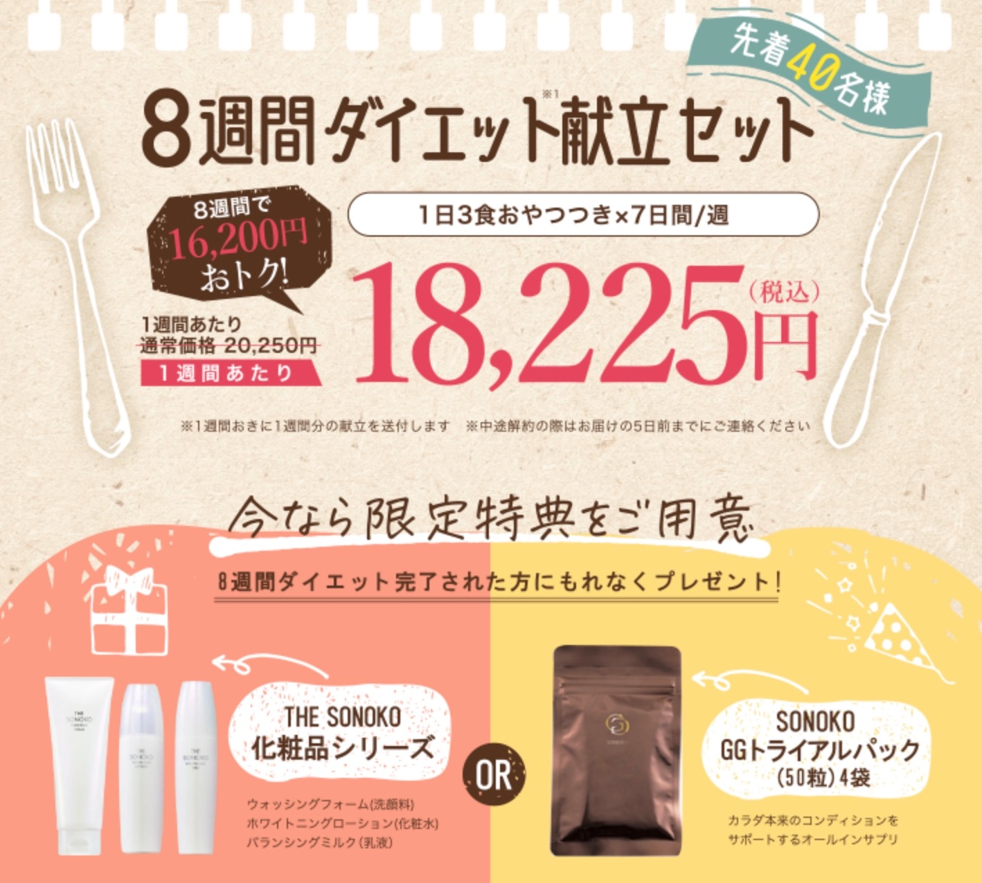 SONOKO8週間ダイエット献立セットは「きちんと食べて、しっかり痩せる感動のプログラム」