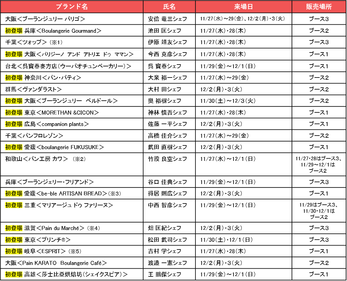 会場内の3つの製造ブースには、大阪で大人気の<ブーランジュリー パリゴ>の安倍竜三シェフを筆頭に、全国各地そして台湾から7日間で計21名のシェフ(うち13名が初登場)が来場し、会場でこだわりのパンを焼き上げます。2~3日で来場シェフが入れ替わるため、会期中何度来場しても新鮮なラインナップをお楽しみいただけます。