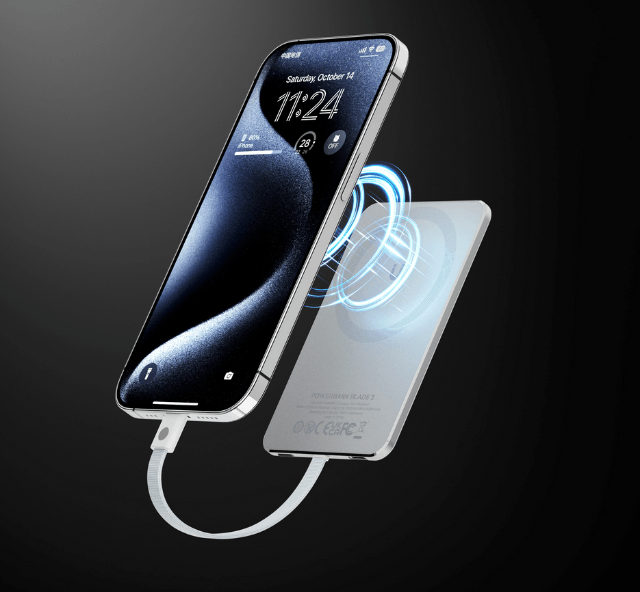 スーツの内ポケットに詰める薄型設計で、会議前の充電もスムーズに。