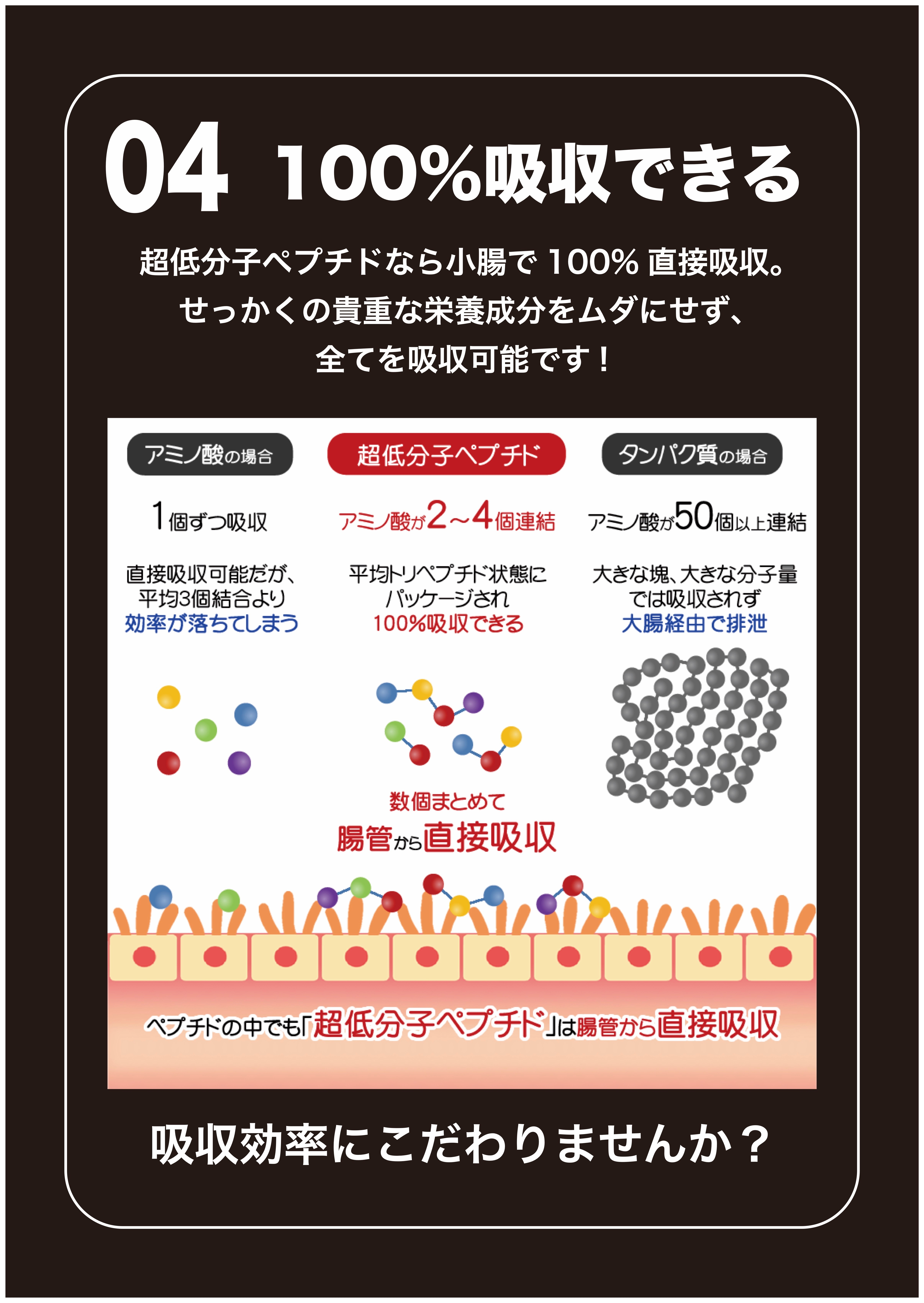 タンパク質として、消化が不要で「100%吸収できるサイズ」である平均分子量500Da以下の超低分子ペプチドで商品化しました。