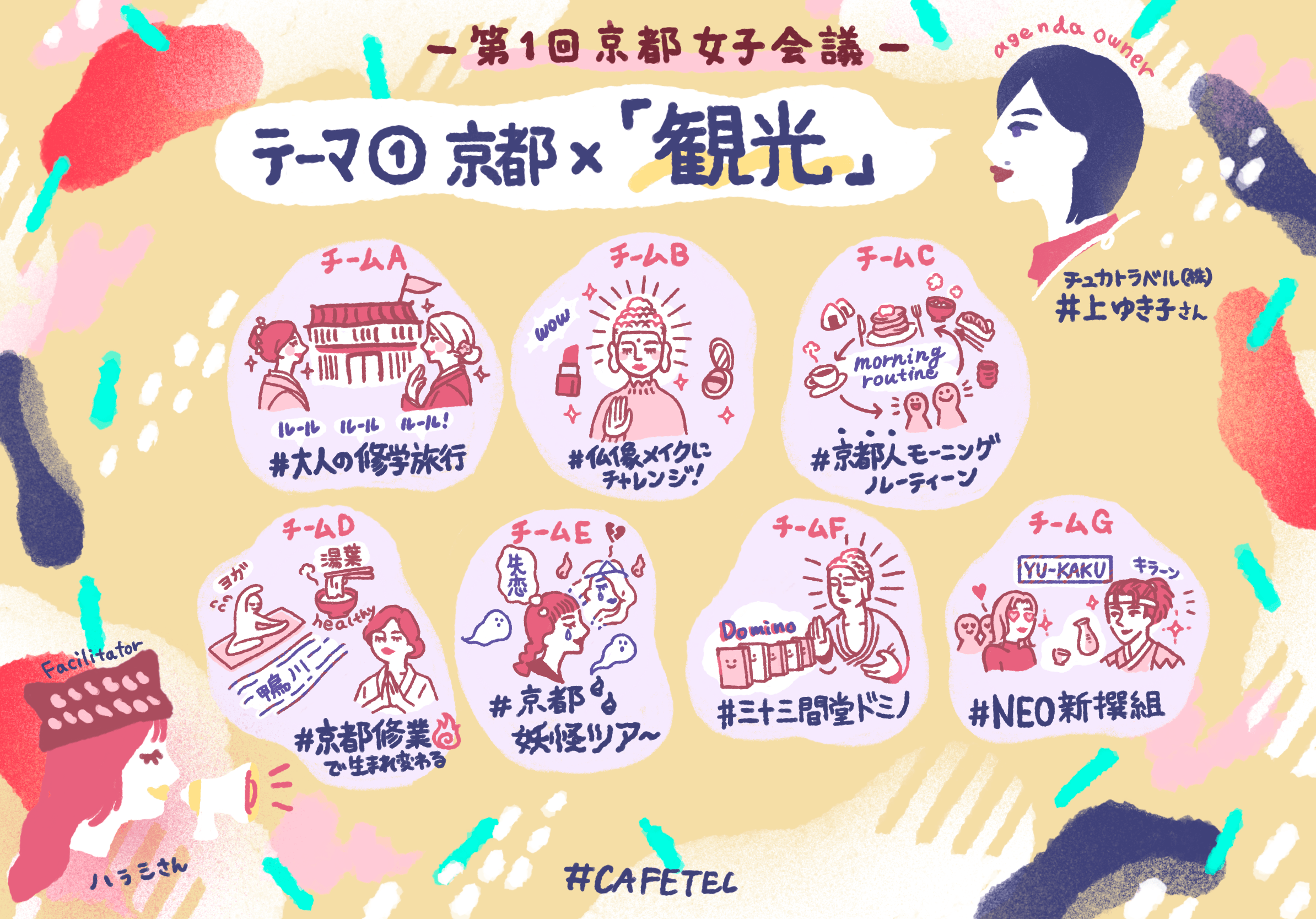 「京都女子会議」第1回コラボブレストを開催するだけでなく、GGLの持つ分析・PR・デザイン力や、CGOドットコムのマーケティング力からの意見交換や派生によって、アイディアを具体的にブラッシュアップさせていきます。CAFETEL京都三条は様々な事業が連携する拠点としても、新しいビジネスチャンスや京都の関係人口創出に貢献したいと考えています。