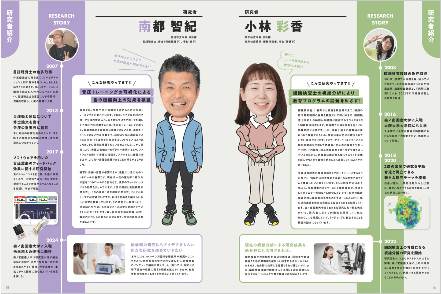 本学は、2024年度科学研究費助成事業(科研費)採択課題数57題、2024年にPubMedに掲載された本学教員が関わる論文61本のうち筆頭・責任著者の論文が33本と、教育力だけではなく研究力の高さも魅力の一つ。また、言語聴覚学科の南都智紀准教授と臨床検査学科の小林彩香准教授のこれまでとこれからの研究活動に注目し、教員のキャラクターや雰囲気もお分かりいただけるような誌面に仕上げました。研究内容や教員の研究に込めた「想い」を是非ご一読ください。