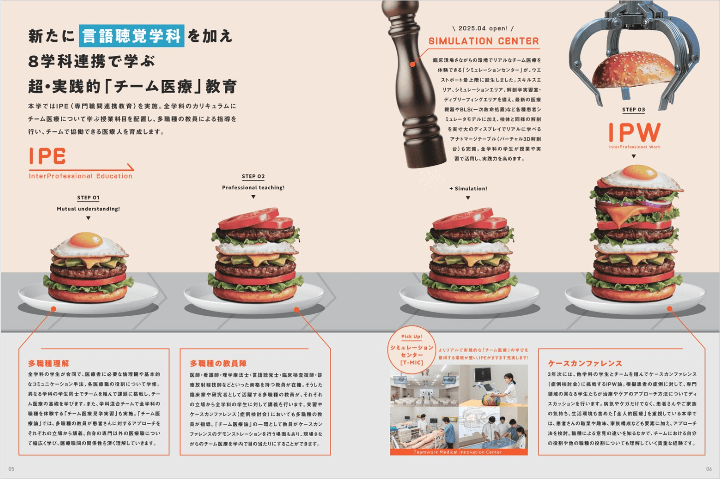 今回制作したvol.2の表紙から次ページに続く導入部分では、2024年4月に開設した言語聴覚学科の学生が始まりを意味する扉を開き、既存7学科の学生と合流することで、8学科となったチームが医療の未来を切り拓いていくことを表現しています。また、シミュレーションセンター(T-MIC)設置により、さらに実践的に進化する本学独自のチーム医療教育、健康長寿社会の実現を目指した研究活動、大阪・関西万博に向けた取り組みをはじめとする様々な地域社会連携活動等を紹介。是非これらの取り組みから本学の「想い」のシカケを感じ取ってください。
