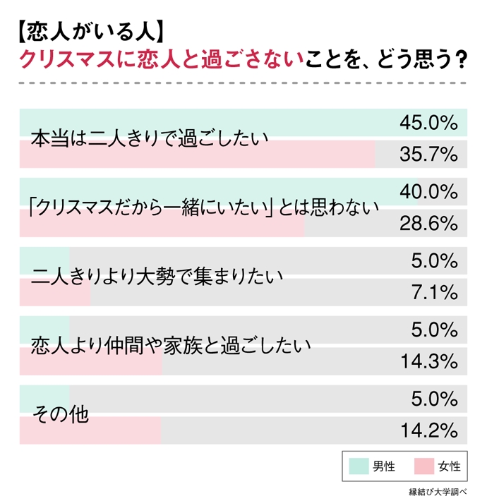 男性に比べて、女性の方が“恋人がいてもクリスマスに二人きりで過ごさない”という人が多い結果となりました。