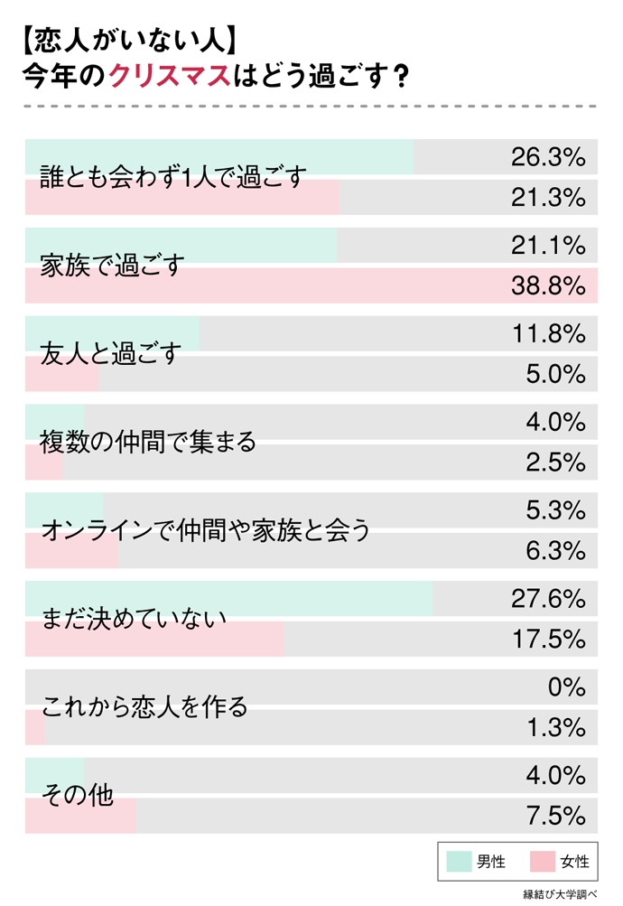恋人がいない人のクリスマスの過ごし方、男性は「1人で」女性は「家族と」過ごす