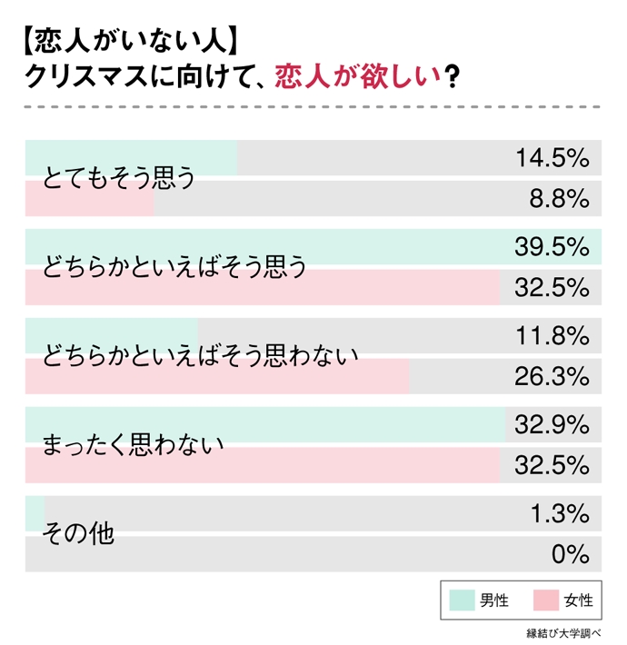 「そもそも恋人が欲しくない」「お金がかかるのが嫌」といった意見以外に、「クリスマスに恋人を作りたい」という考え方そのものがダサい、イタいと感じている人も一定数いることが分かります。