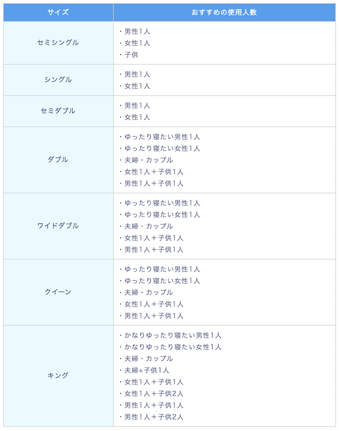 マットレスサイズについてのアンケート調査結果を踏まえ、おすすめの使用人数をまとめると、次のようになります。