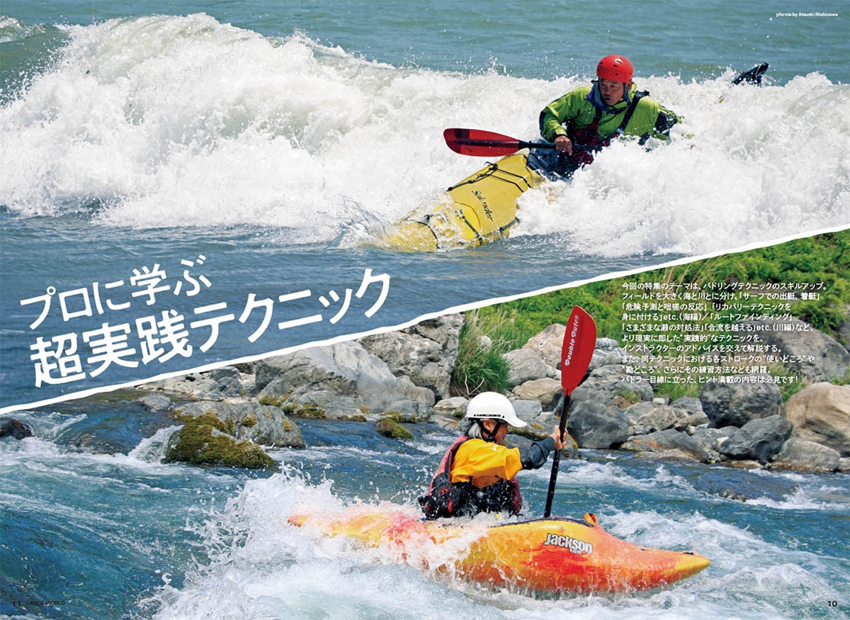 巻頭特集は、「プロに学ぶ 超実践テクニック」。フィールドを大きく海と川とに分け、より現実に即した“実践的”なテクニックを、インストラクターを招いて解説しています。そのほか、パックラフト指南「パックラフトでいい気分!」、「ファルトボートに首ったけ!」、「水辺の漕ぎ語り」、「芳地直美のプカプカ水上散歩」など、魅惑的なコンテンツを多数ご用意しています。