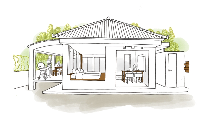 沖縄のモダン建築であるコンクリート造平家建て。バーベキューテラスのあるお部屋です。公民館や、伝統的な糸紡ぎ・機織りの見学ができる芭蕉布会館がすぐそばにある集落の中心地にあります。