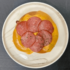 サラミのスパイシーな風味とチーズの濃厚なコクが特長のおつまみに最適な一品。サラミの旨味が噛むたびに口の中に広がり、チーズのクリーミーさがそれを包み込むことで、豊かな味わいを楽しむことができます。ビールやワインとの相性も抜群で、今日の晩酌のお供にぴったりです。