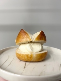 贅沢な練乳バタークリームをたっぷりと絞り込んだ一品。練乳の優しい甘さとバターのコクが絶妙に調和し、ブレッツェルの生地と見事にマッチしています。程よい甘さに仕上げているため、甘いものが苦手な方でも食べやすく、幅広いお客様にご好評をいただいています。