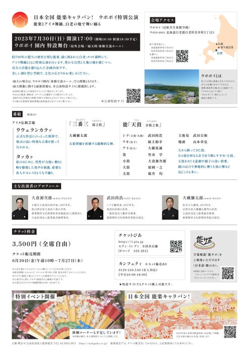 公益社団法人能楽協会主催、『日本全国 能楽キャラバン! ウポポイ特別公演』が2023年7月30日 (日)にウポポイ(民族共生象徴空間)園内 特設舞台(北海道白老郡白老町若草町2丁目3)にて上演されます。