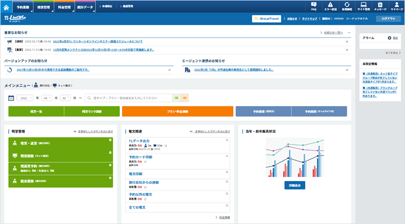 宿泊施設向けの予約・販売管理システム「TL-リンカーン」は、旅行会社とネット販売からの通知を一元管理し、残室・料金調整が一括でできるASPサービス。ネット販売は複数の管理画面を個々に開いて管理する必要がなくなるため、オーバーブックを回避し、販売機会を最大限広げることができます。またホテルシステム(PMS)とのデータ連携も可能なため、通知情報の手入力、転記等の業務負荷も軽減。業務改善と増売を同時に実現することができます。