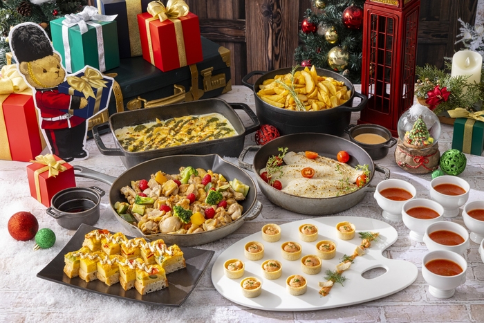 今回のクリスマススイーツビュッフェは、愛らしいテディベアたちがクリスマス支度を進める美しいロンドンの街並みが舞台。近衛兵やホテルスタッフの制服を身にまとったベアが皆様をお迎えいたします。スイーツには、アールグレイティークリームを巻いた「アールグレイ香る 桃のブッシュ・ド・ノエル」や、スコーンにバタークリームと苺ジャムをサンドして苺を飾った「苺のスコーンサンド」、英国の伝統菓子といわれる「イギリス発祥 キャロットケーキ」の他、フルーツたっぷりの「フルーツリースミニタルト」や「サンタのラズベリーマカロン」などフェスティブシーズンにぴったりなメニューをご用意。また、ホテルのアメニティタオルをモチーフに、韓国のSNSで話題のタオルケーキをティラミス風の味わいに再現したクレープも登場いたします。セイボリー(軽食)は、フランボワーズの甘酸っぱいソースで楽しむ「ローストチキン フランボワーズ香るグランヴヌールソース」、こんがりとした焼き色が食欲をそそる「グラチネしたジェノベーゼクリームパスタ」、「トマトコンソメスープ」などが並びます。約35種類ものスイーツとセイボリーが並ぶクリスマススイーツビュッフェをご堪能ください。