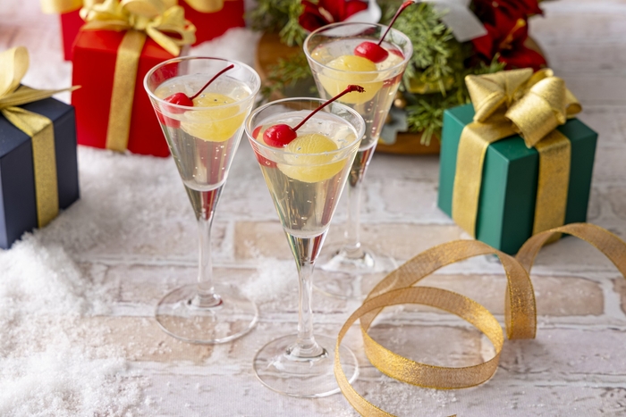 サンタさんを囲むサプライズクリスマスパーティーの乾杯ドリンクをイメージしたグラスデザート。ノンアルコール白ワインを使ったフルーティーなゼリーに、ピオーネとチェリーを飾って彩りを添えました。