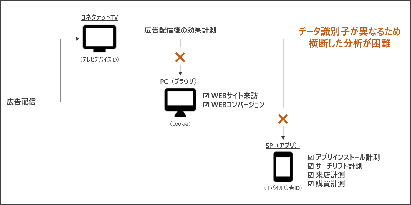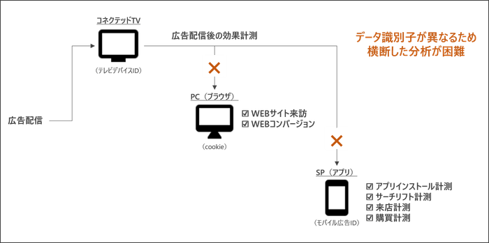 これまで、コネクテッドテレビデバイスでの広告展開においては、従来のウェブブラウザ、スマートフォンアプリとは異なるデータ識別子であるが故に、従来デジタルマーケティングにおいて行うことが出来た様々な分析が困難であるという課題がありました。