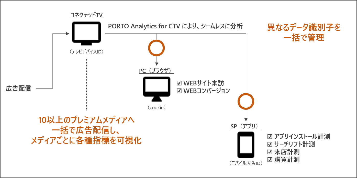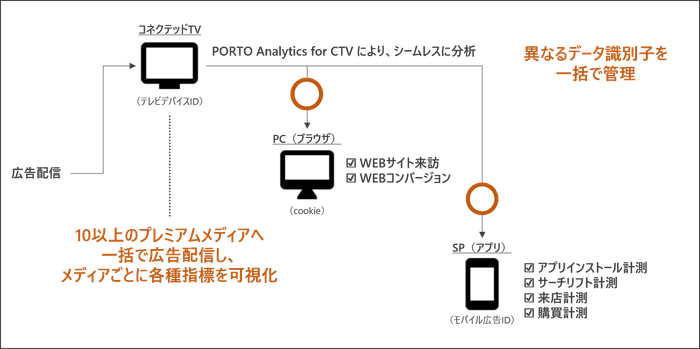 本サービスは、広告の配信環境や広告主のコンバージョンポイントによって異なる識別子を一括で管理し、ログレベルでシームレスに分析致します。さらにPORTO DSPから配信可能なメディアごとに効果を可視化することで、コネクテッドTVでの広告キャンペーンにおけるPDCAが可能です。