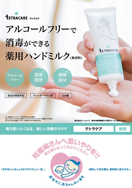 当社製品の「テトラケア」は、”手のトラブルをケア”したいという想いから生まれた、新たな日常で頑張る手に優しく寄り添うブランドです。コロナ禍における妊産婦さんの外出時の手指消毒、手荒れの悩みをサポートし、マタニティマークを通して妊産婦さんに優しい環境づくりを応援したいという想いから、タイアップ広告掲出にいたりました。