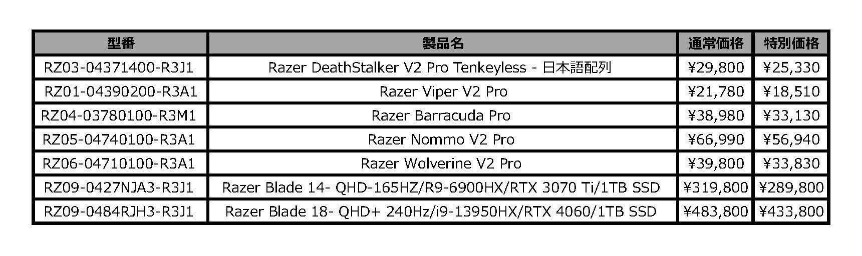 その他にも、60gを切る超軽量設計ながら、99.8%の解像精度を誇り、超高速入力と正確な操作を可能にするワイヤレスゲーミングマウス「Razer Viper V2 Pro」や、PlayStation(R)公式ライセンスを取得したハイパフォーマンスワイヤレスコントローラー「Razer Wolverine V2 Pro」などのプロレベルの性能を備えた製品はもちろん、自動調整ノイズキャンセリングで最高の没入体験を提供するワイヤレスヘッドセット「Razer Barracuda Pro」や、幅広い音域をカバーする豊かな音域と、大音量でもクリアなサウンドを実現するスピーカー「Razer Nommo V2 Pro」などゲーム環境をさらにリッチにする製品が特別価格の対象となっています。