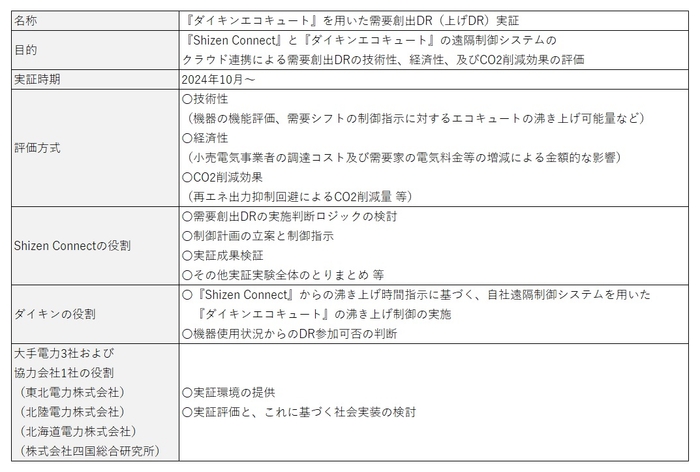VPP(*1)プラットフォーム開発会社の株式会社Shizen Connect(以下、Shizen Connect)と空調総合メーカーのダイキン工業株式会社(以下、ダイキン)は、再生可能エネルギー(以下、再エネ)の有効活用を目的に電力需要を創出するディマンド・リスポンス(以下、需要創出DR)(*2)において、家庭用ヒートポンプ給湯機エコキュートの沸き上げ時間を、再エネの発電量が多い時間帯にシフトする有効性を検証する実証実験(以下、本実証)に共同で取り組みます。本実証は、東北電力株式会社、北陸電力株式会社、北海道電力株式会社、四国電力グループの株式会社四国総合研究所とともに、2024年10月より開始します。
